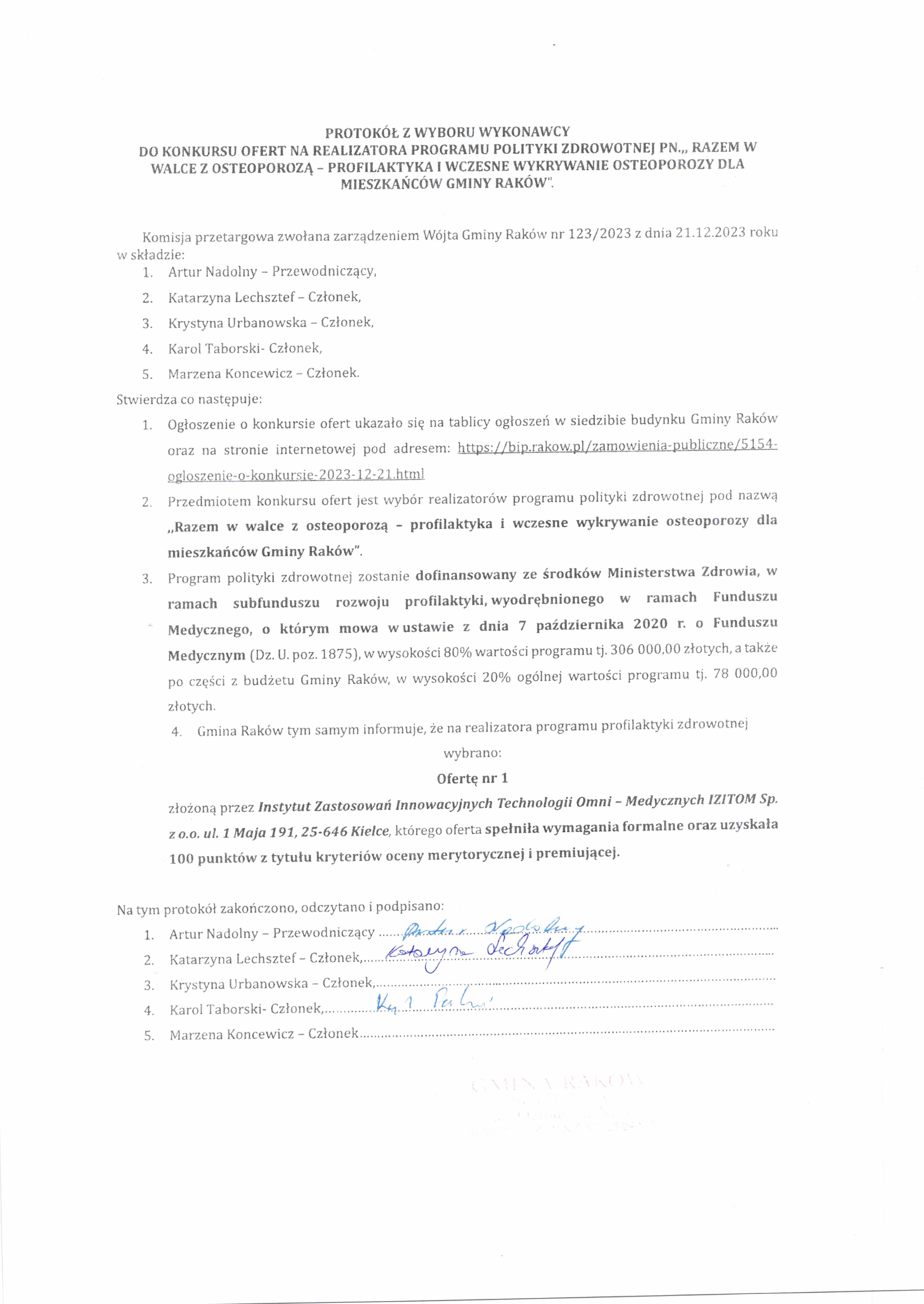 na realizatora programu polityki zdrowotnej pn.,, Razem w walce z osteoporozą – profilaktyka i wczesne wykrywanie osteoporozy dla mieszkańców Gminy Raków”.